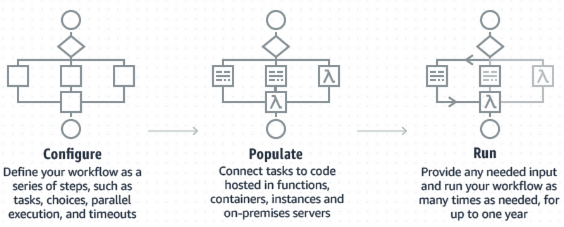 Step Functions’s core contract involves the developer defining the steps of a workflow and the code to run each step. Then whenever this workflow is executed, AWS manages its state and calls the right step at the right time.