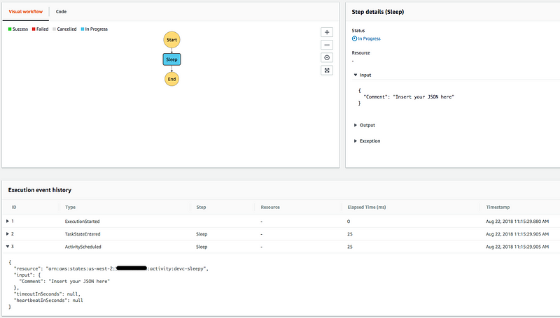 But even in the most well-defined workflow, you’ll inevitably have workflows that fail for reasons you don’t immediately understand. Luckily Step Functions provides a build in audit log of every execution’s progress through your workflow. This includes inputs, outputs, errors, timings, retries, and timeouts for the whole execution. This kind of detailed debugging info makes noticing issues and pinning them down to individual workflow steps trivially easy with no additional effort on your part.
